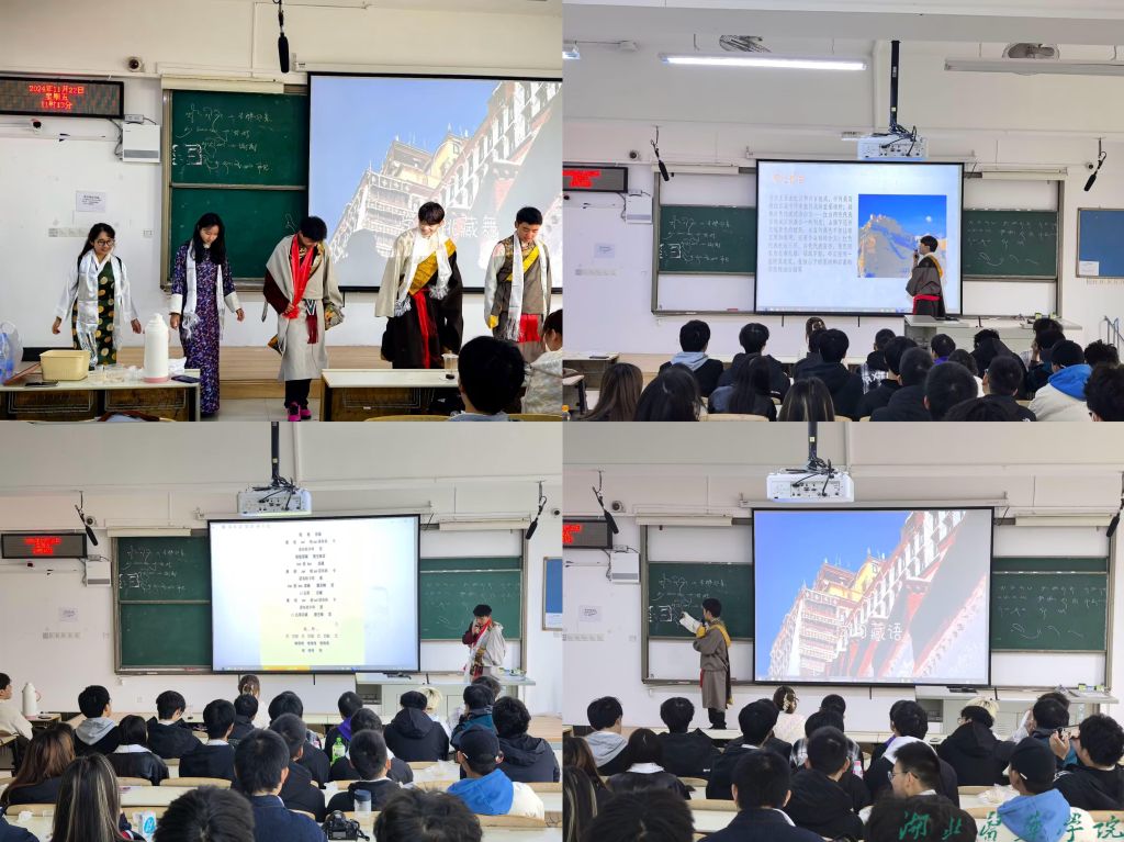 交流活动包括藏族历史讲解、语言文化学习、地域风俗推介、特色美食制作等内容,江白多吉用生动的语言和精美的图片,带领大家领略了雪域高原的壮丽景色和藏族人民的独特魅力;旦真扎西教授汉族同学一些简单的藏语日常用语,如“你好”、“谢谢”、“再见”、“吉祥如意”等;旦增赤列带领同学们逐句学唱藏族歌曲《罗布林卡》,沉浸式体验并感悟藏歌的特别之处;江白多吉、旦增赤列、次旦珍拉、尼玛普赤、旦真扎西身着藏族服饰示范了藏舞的基本动作,如踢踏、旋转、摆手等;在藏族同学的指导下,同学们一起动手制作了糌粑、酥油茶等传统藏族食品,不仅学习了藏族美食的制作技巧,更深刻体会到了藏族饮食文化的独特魅力。活动最后藏族汉族同学互戴哈达,表达了藏族同学们的热情好客和彼此尊重的愿望。