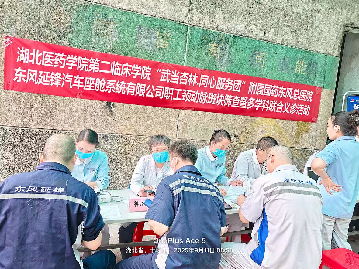 (本网讯通讯员:董发虎)在现代社会快节奏的工作模式下,企业职工的健康问题日益受到关注。颈动脉斑块作为心脑血管疾病的重要预警信号,若未能及时发现和干预,可能对职工健康造成严重威胁。为切实解决职工健康需求,搭建便捷的医疗服务桥梁,提高职工对自身健康的重视程度,普及健康知识,9月11日,第二临床学院武当杏林・同心服务团联合附属国药东风总医院,走进东风延锋(十堰)汽车座舱系统有限公司,开展了一场职工颈动脉斑块筛查暨多学科义诊活动。此次活动吸引了众多企业职工积极参与,为他们带来了便捷、专业的医疗服务。